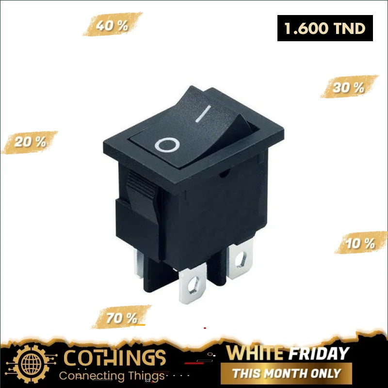 L'interrupteur à bascule KCD1-4-201 t85 55 est un interrupteur DPST miniature conçu pour un fonctionnement ON-OFF. Il est doté d'un boîtier en nylon 66 et de bornes en laiton plaqué argent. Le bouton est disponible en noir, rouge ou blanc. Il a une valeur nominale de 10A 125VAC/6A 250VAC et une résistance de contact de 35mOhm max. Le commutateur peut fonctionner à des températures allant de -25 °C à +85 °C et a une durée de vie électrique d'au moins 10 000 cycles. Sa rigidité diélectrique est de 1 500 VCA pendant 1 minute et sa durée de vie mécanique est supérieure à 100 000 cycles. Le commutateur est certifié CE, CQC et SGS, et des options OEM ou ODM sont disponibles.