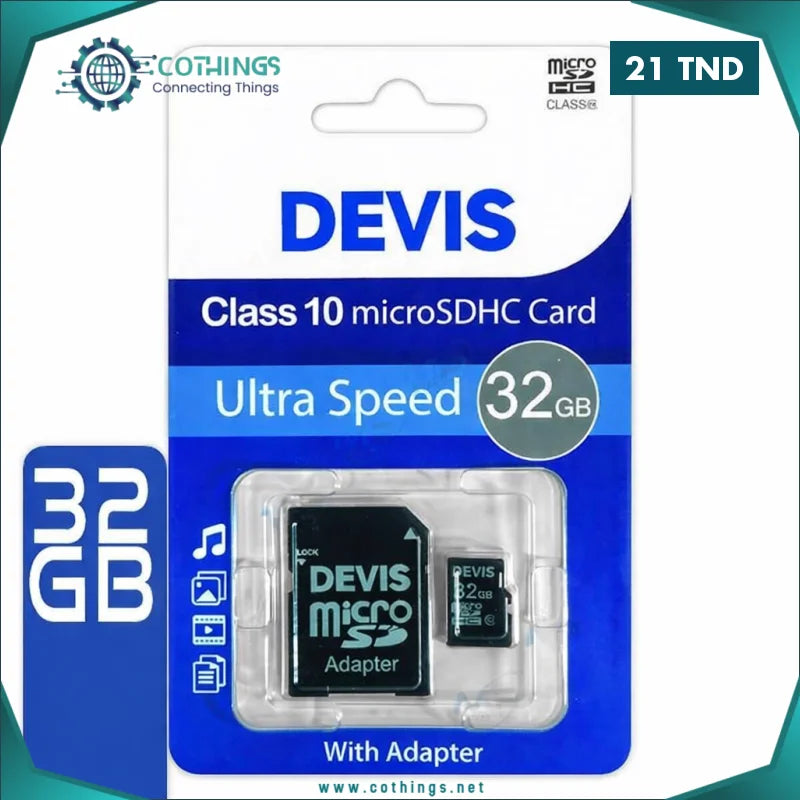 La carte mémoire DEVIS microSDHC 32GB est un support de stockage fiable et performant, conçu pour smartphones, caméras de surveillance, tablettes, appareils photo et autres dispositifs compatibles microSD.