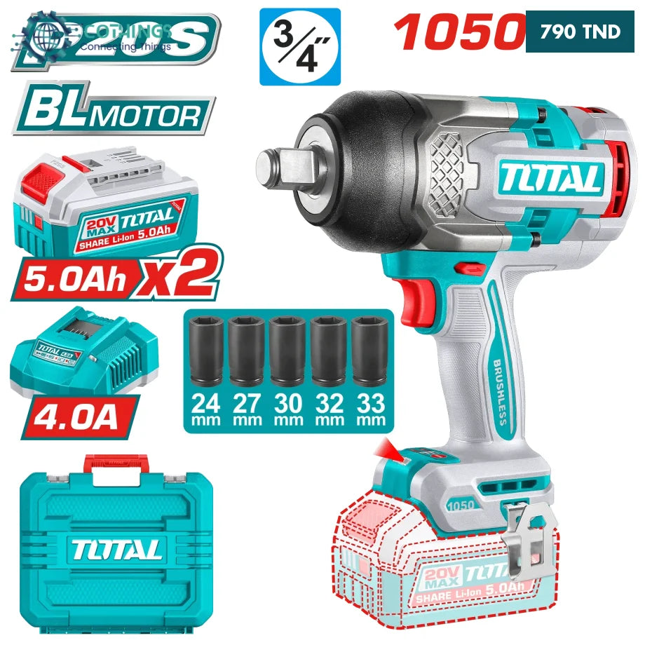 TOTAL Clé À Choc Sans Fil 3 Sur 4 Carré 1050 Nm 20 V Brushless Pro TIWLI20105