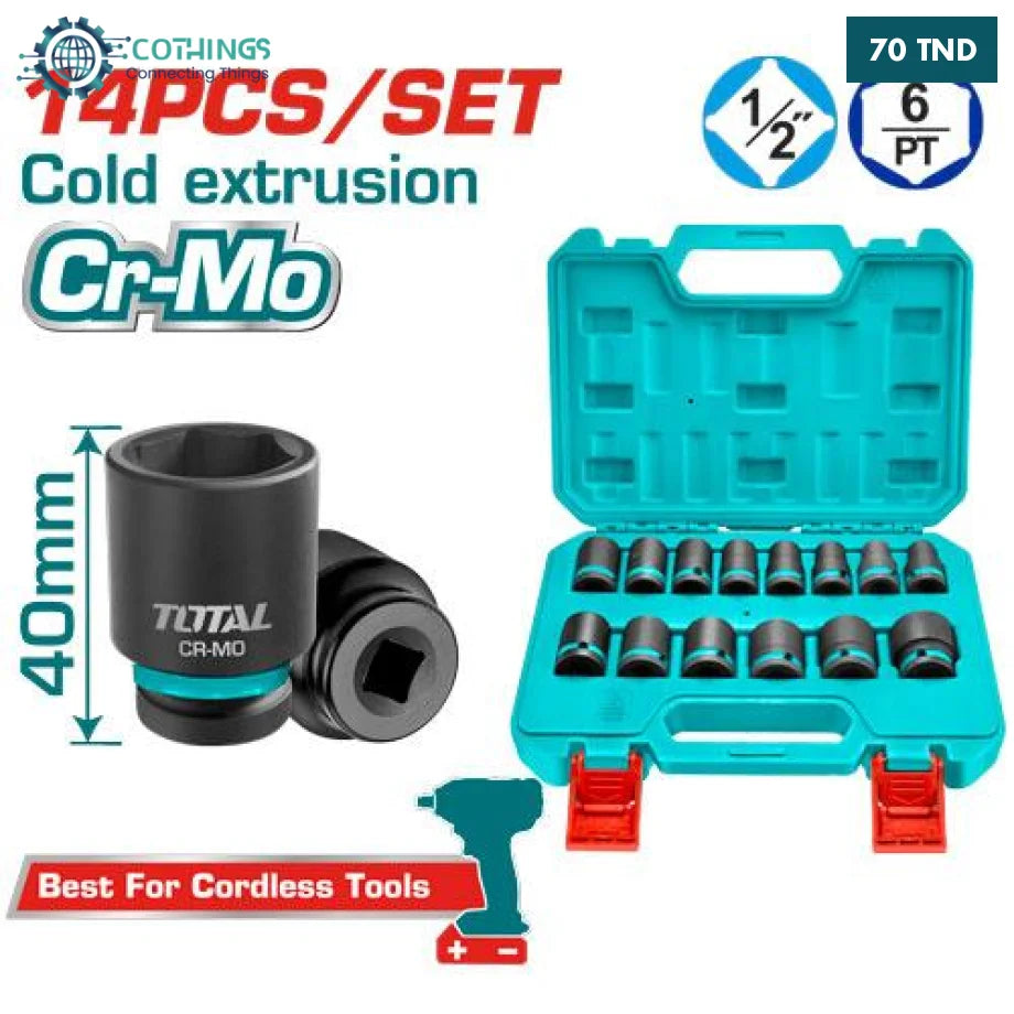 Puissance et fiabilité au service de vos interventions mécaniques: le Jeu de 14 douilles à choc 1/2" DR TOTAL accélère vos réparations tout en prolongeant la durée de vos outils.