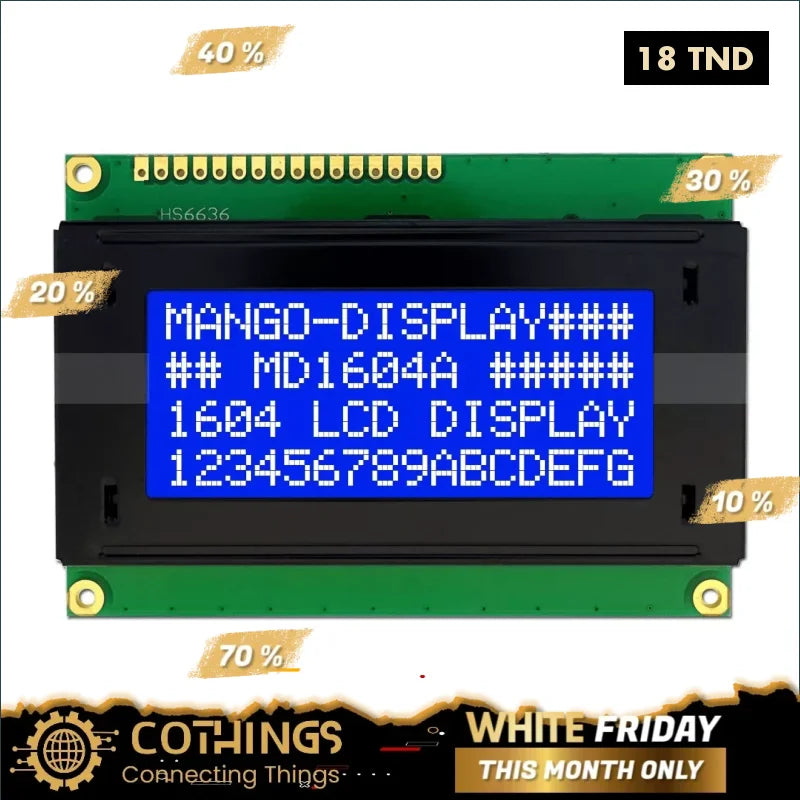 L’écran LCD 1604 est un afficheur classique à 4 lignes de 16 caractères offrant une excellente visibilité grâce à son rétroéclairage bleu. Idéal pour les projets Arduino, ESP32, Raspberry Pi ou autres microcontrôleurs, il permet d’afficher facilement des messages, menus ou données en temps réel.