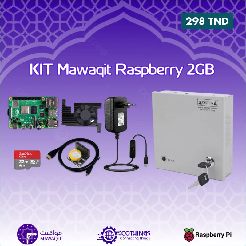 Le Kit Mawaqit Raspberry Pi 2GB est une solution professionnelle clé en main destinée à la diffusion du système Mawaqit dans les mosquées.