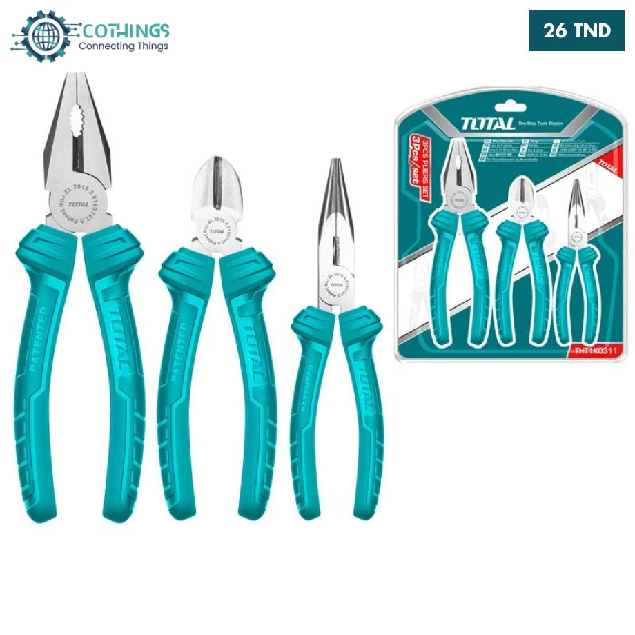 Ce trio TOTAL de pinces en acier haute résistance maximise la productivité en offrant une prise ferme, une coupe précise et une durabilité professionnelle pour vos interventions électriques, mécaniques et de bricolage.