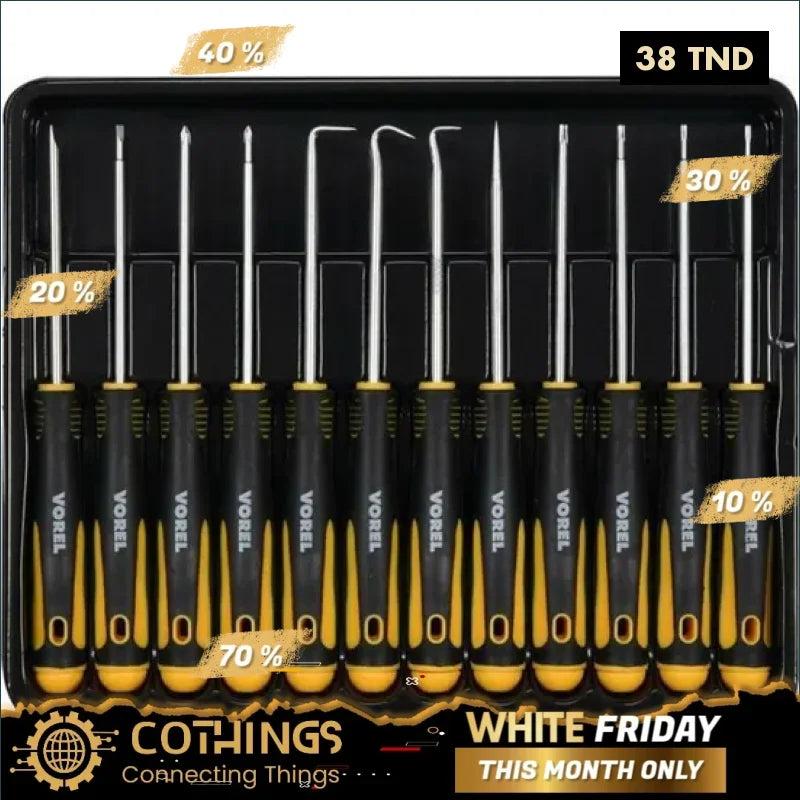 Découvrez le jeu de tournevis et crochets de précision Vorel 64555, comprenant 12 pièces. Idéal pour des travaux de précision, ce kit est parfait pour les professionnels et les amateurs. Sa forme de pointe assure une utilisation optimale et un accès facile aux zones difficiles.