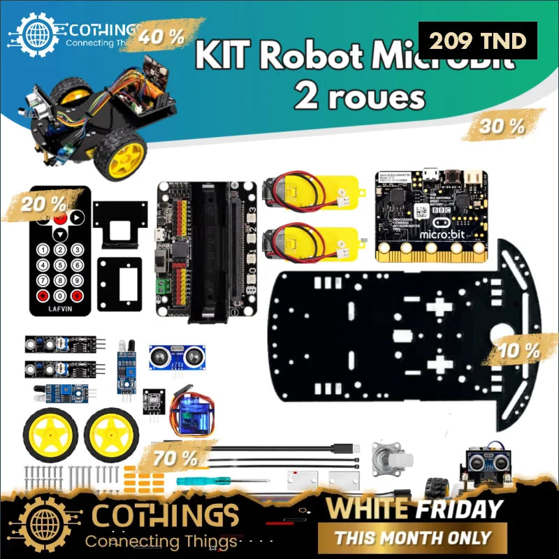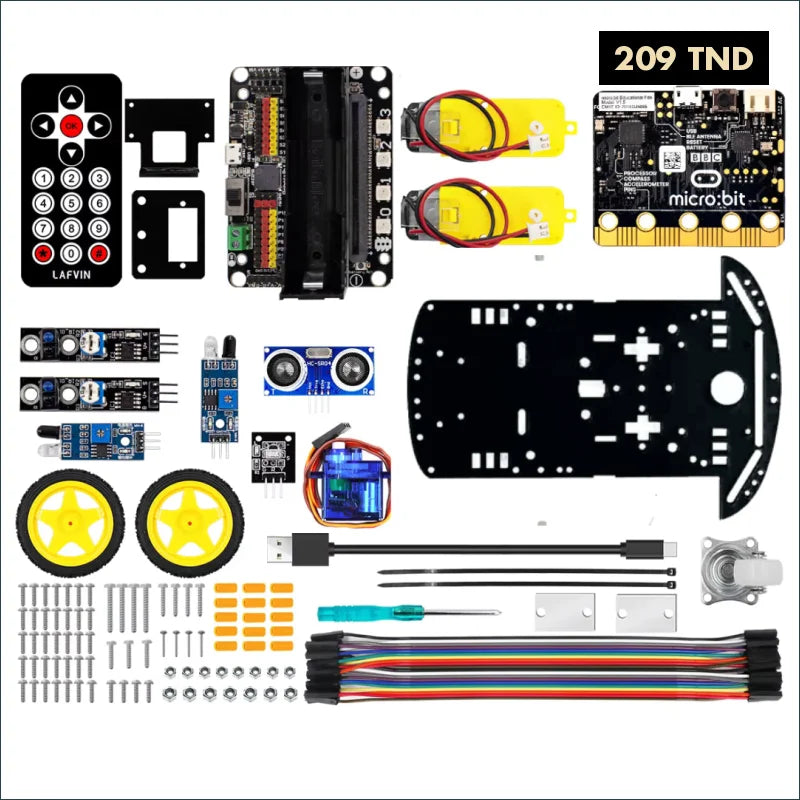 Le Kit Robot 2WD Micro:bit est un ensemble complet tout-en-un pour monter sa première voiture robotique : châssis robuste, motorisation, capteurs (ultrason, ligne, luminosité), servo, télécommande IR et carte micro:bit (compatible MakeCode / Python). Conçu pour l’enseignement et le prototypage, il permet d’apprendre la logique de pilotage, la détection d’obstacles, le suivi de ligne et la télécommande à distance. Montage simple, documentation pédagogique et compatibilité avec les environnements de programmation visuels (MakeCode) ou textuels (MicroPython).